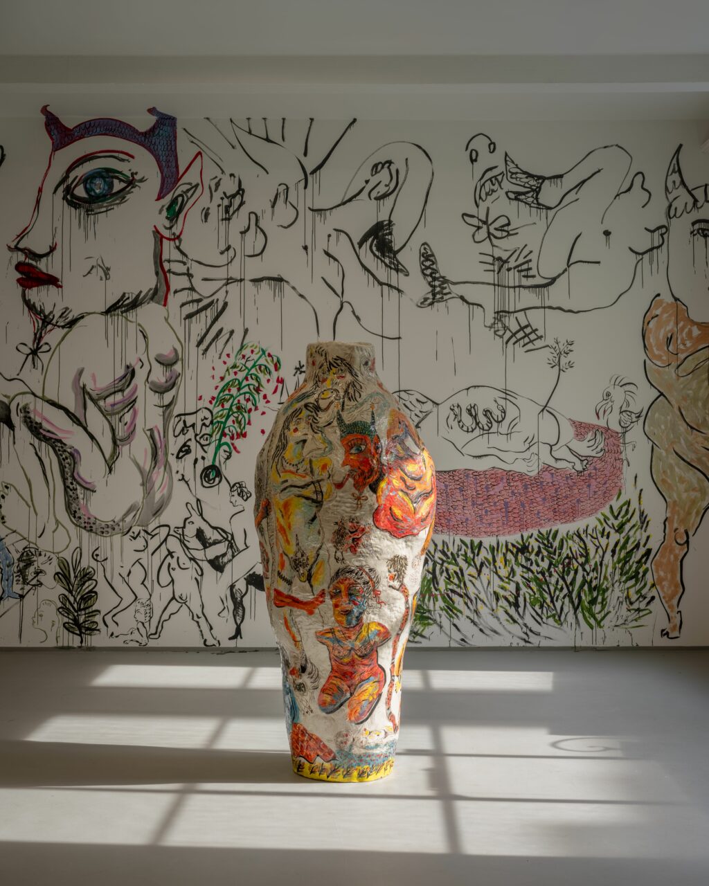 Boumjimar’s practice delves into what it means to be human: the social boundaries and hierarchies that shape us, the experiences of marginalised communities, and possible forms of coexistence between humans and nature. His works unleash a wild, unapologetically expressive menagerie of feminine, masculine, and animalistic figures.