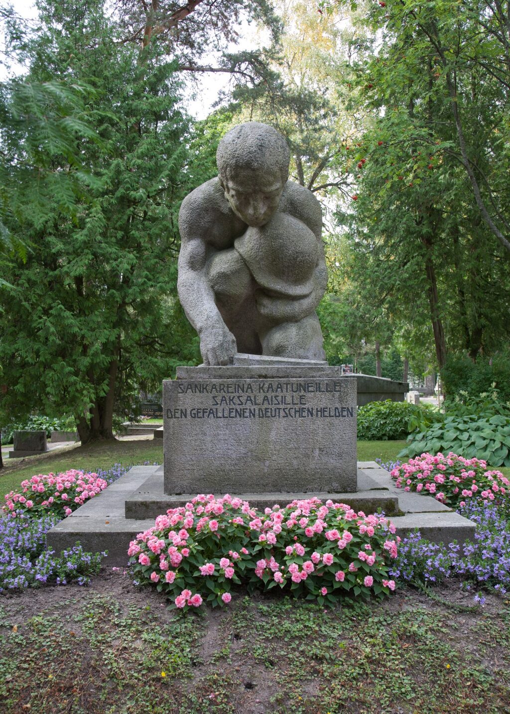 The city council of Lahti decided in 1918 to erect a monument to German soldiers who had fallen during the occupation of the city that year. The site of the monument was the old cemetery on Radiomäki hill. A memorial sculpture created by Willehard Martin and his pupil Urho Heinänen was placed in the middle of the German soldiers’ burial ground. The names of the fallen are inscribed on the base, along with their birth and death dates and the text: “For fallen German heroes, Den gefallenen deutschen Helden.” The granite statue depicts an unclothed soldier on his knees. His head is bowed, and he holds a German helmet to his chest with his left hand as his right lowers a sword to the ground.