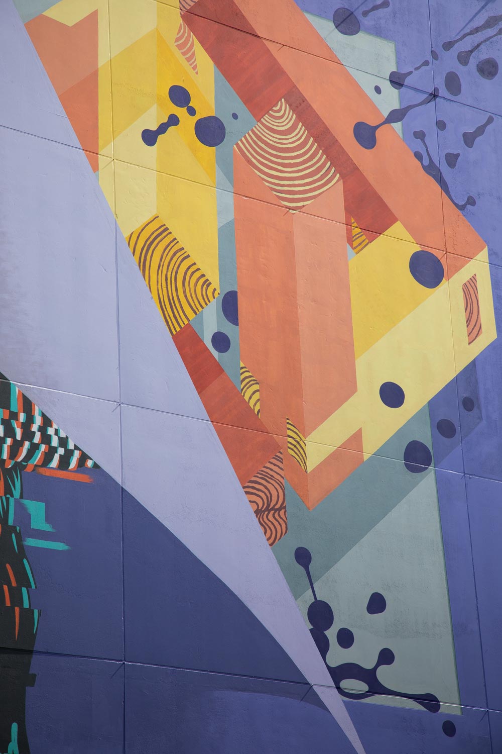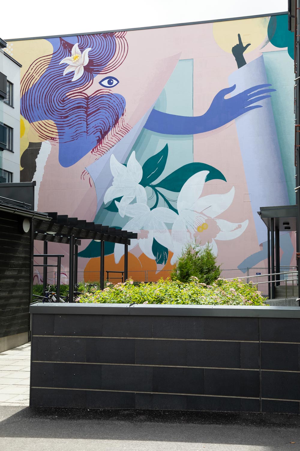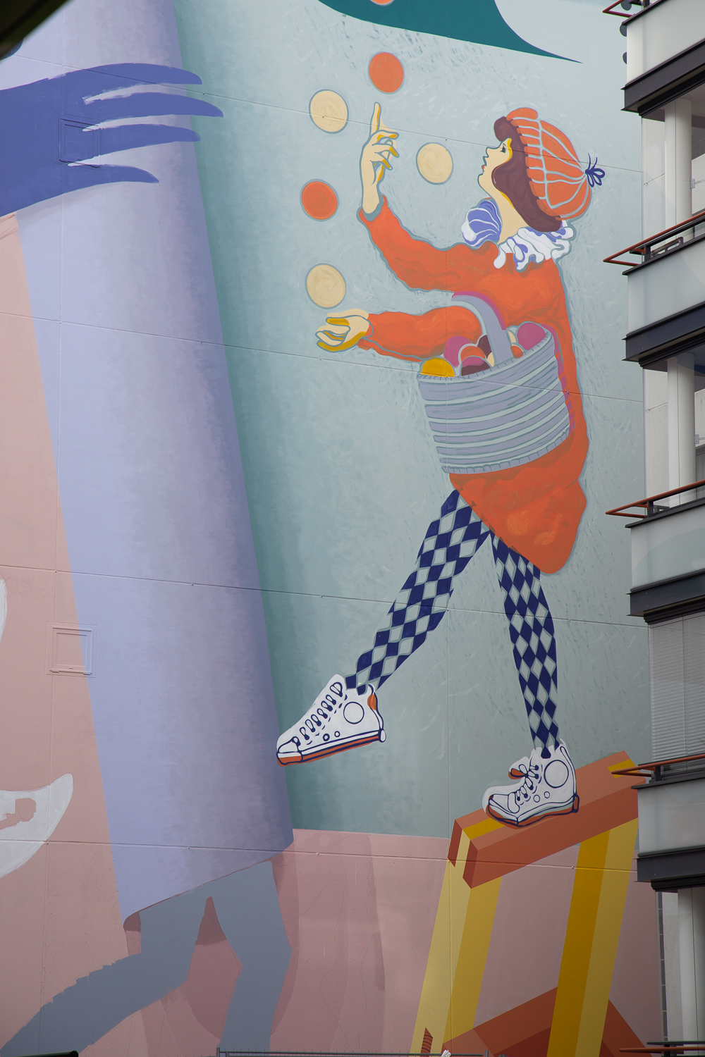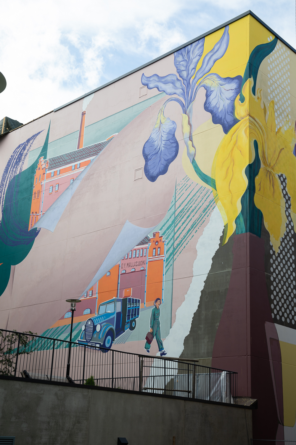 The Block Party mural was designed by artists Laura Lehtinen and Maikki Rantala. It was realised in the summer of 2020 on three façades of the Malski Centre. A total of 1,500 square metres of wall surface are covered by the work. The mural evokes the industrial history of Lahti and the current operations of the Malski Centre. Its references include the old Mallasjuoma factory, the beverage company Hartwall, poster art, and the history of timber construction and the furniture industry in Lahti. In addition to the mural, Block Party includes a gobo design projected onto the wall and a silkscreen relief in the Malski lobby, reproduced from a painting on the façade.