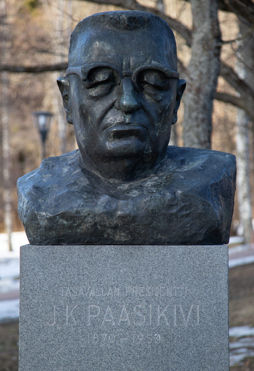 The bronze bust designed by Pentti Papinaho depicts Paasikivi’s face in a realistic style.