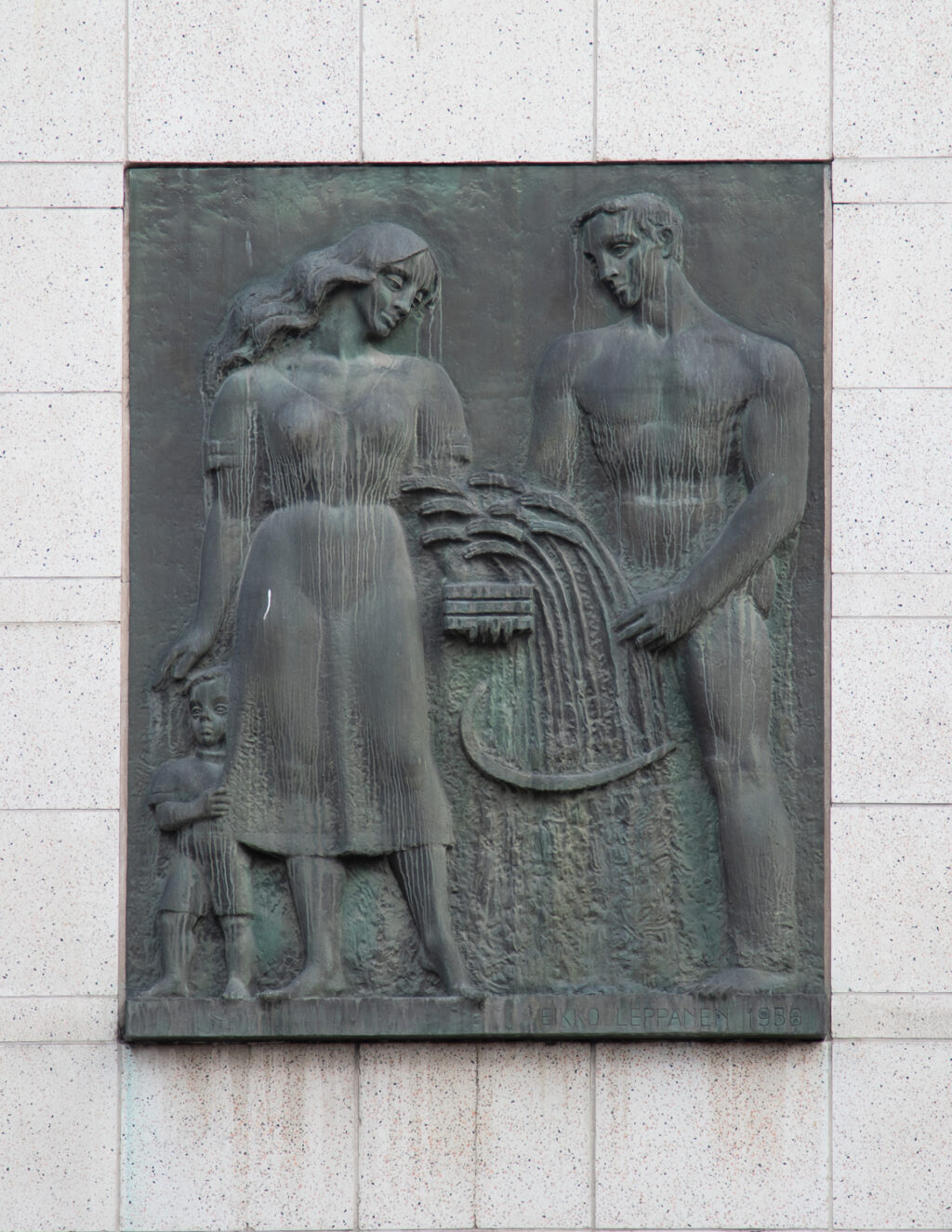 Veikko Leppänen’s relief Harvest depicts a farmer’s family: husband, wife and child with stalks of wheat. The husband is gathering the harvest into a sack, while the wife is holding a stack of books. The child tugs at the hem of the mother’s dress, peeping timidly from behind her mother’s back. Through the theme of harvest, the work refers to the virtues of thrift and wisdom. The idea of saving also connects the relief to the site, the wall of a bank building.