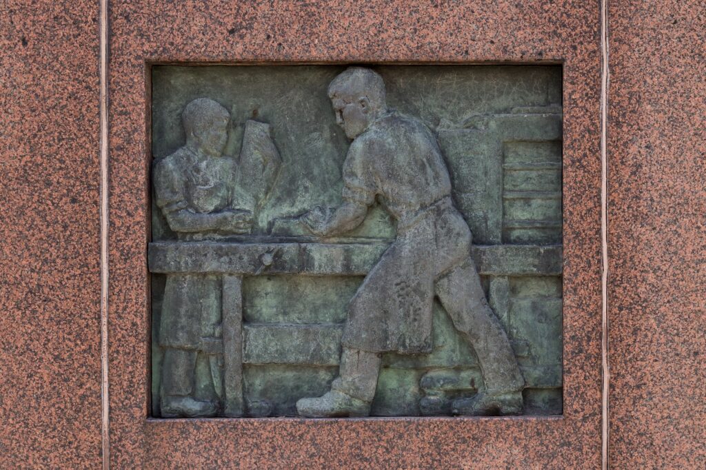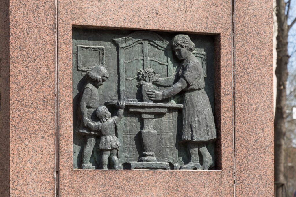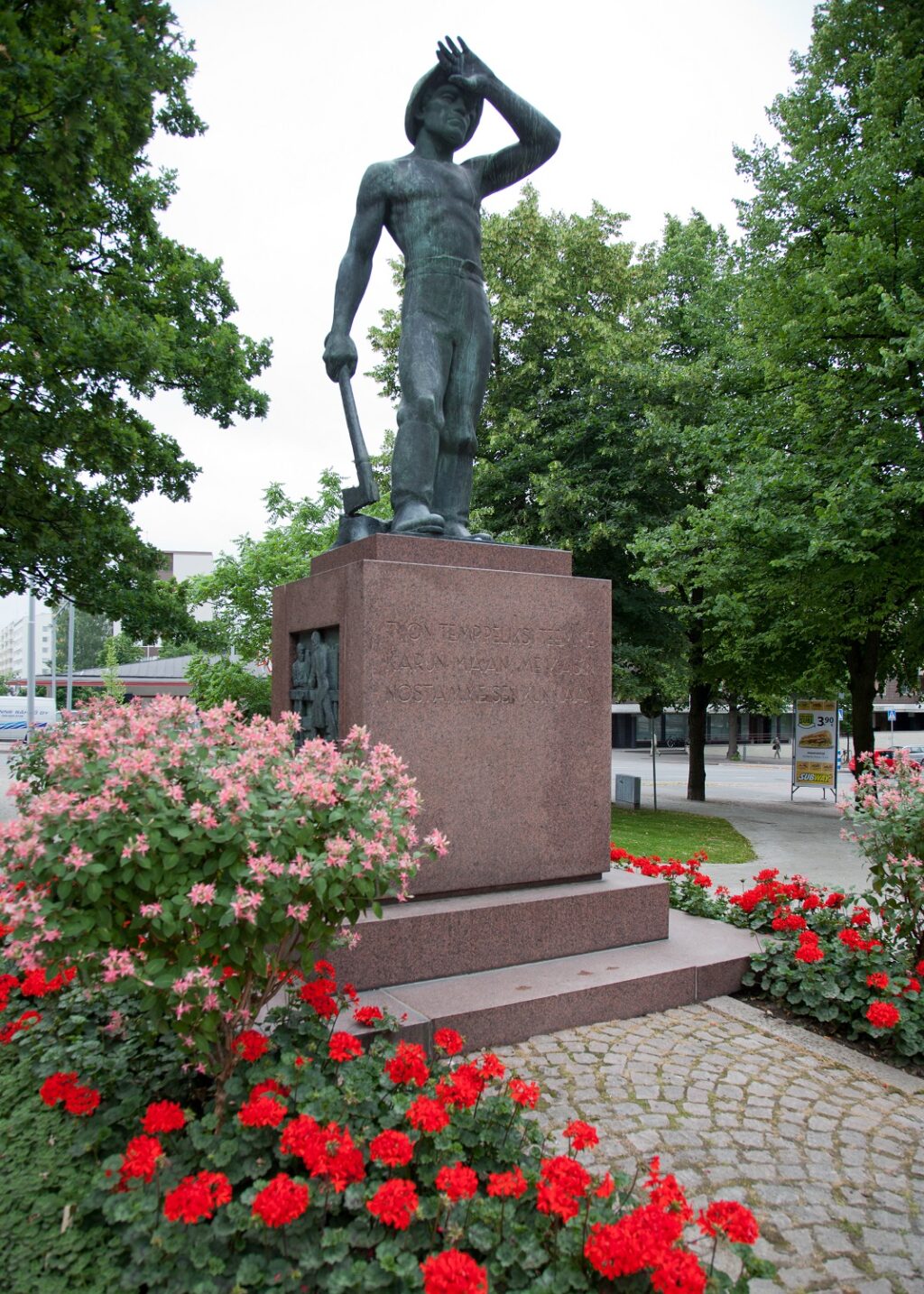 Factory owner Aukusti Asko-Avonius donated this statue to the town of Lahti in 1946. Designed and financed by himself, it was erected in the City Hall park, opposite Statue of Liberty a year later. The statue was made by sculptor Yrjö Liipola.