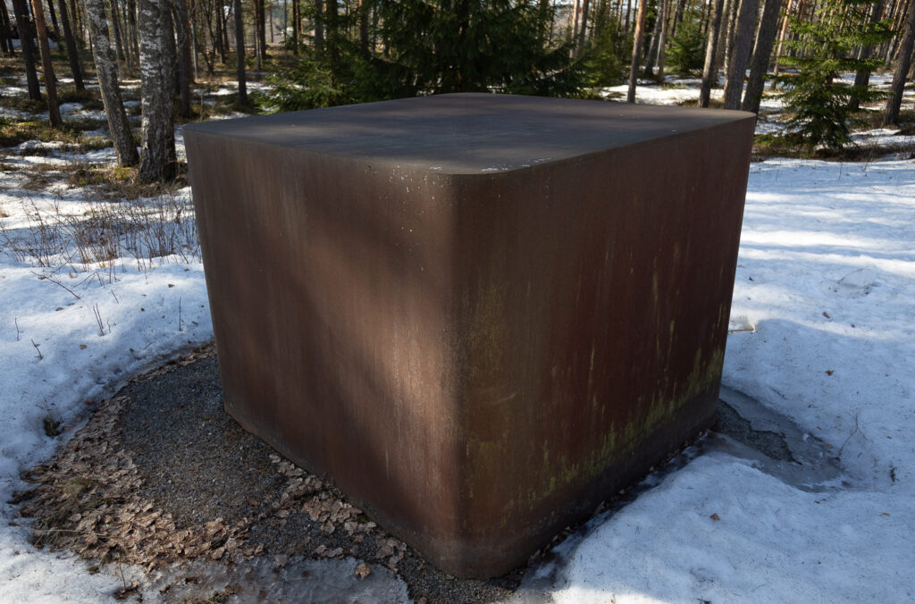 Hannu Siren’s Magma at the sculpture complex on Radiomäki hill is a minimalist work with a slightly sloping top. The steel surface of the abstract monolith has a rusty patina throughout. Of particular note is the work’s material, which evokes coldness and hardness, and the dynamic of its precise mathematical form in relation to the surrounding nature. The massive work engages in a striking, if sparse, dialogue with the delicate vegetation that surrounds it. Having left its mark on the sculpture in the form of corrosion, nature has literally become part of the artwork.