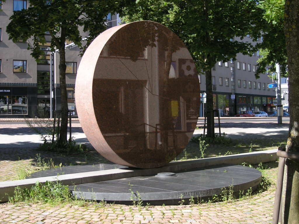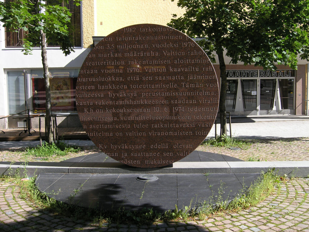 A competition was held in autumn 1999 for a monument to Teemu Hiltunen, former Secretary of State and Mayor of Lahti. Four Lahti-based professors were invited to take part: Mauno Hartman, Reino Hietanen, Matti Koskela and Olavi Lanu. The winner was Matti Koskela’s entry Paragraph. In 2002, the finished work was erected in Vaahtera Square in front of the Kansantalo community hall.