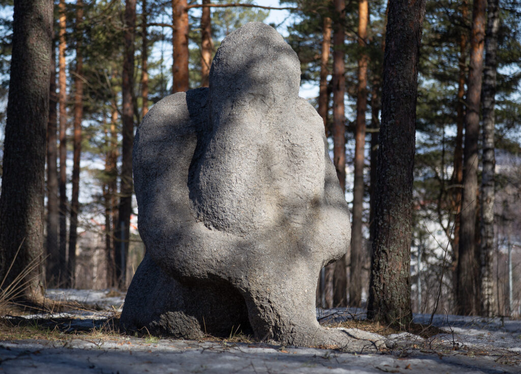 Faceless human figures that blend into the material they are made of are a familiar motif in Olavi Lanu’s works. Such figures can also be found on the Radiomäki hill, curled up, lying on the ground or on a pedestal, either sitting or gathered in a group. Made of fibreglass and concrete, the sculptures combine natural motifs with human ones, with Lanu’s characteristically intriguing and fragile style merging with a laborious and demanding sculptural technique that mimics natural surfaces. Blending in with their surroundings, the mysterious figures can come as a surprise to visitors who encounter them for the first time.