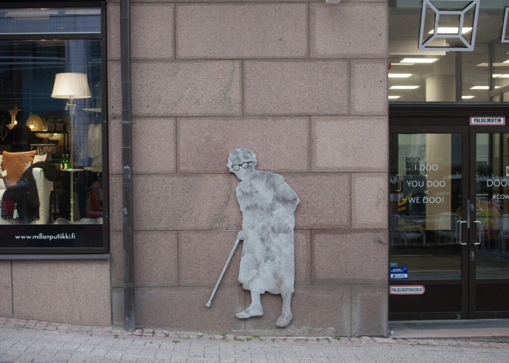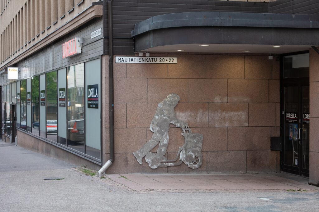 Sami Leutola’s Steel Grannies is a series of four human figures cut from steel and placed on the street level in various parts of Rautatienkatu street. The work is a tribute to grandmothers, that is, super grannies who often go unnoticed by passers-by. The following four grannies can be found along Rautatienkatu: