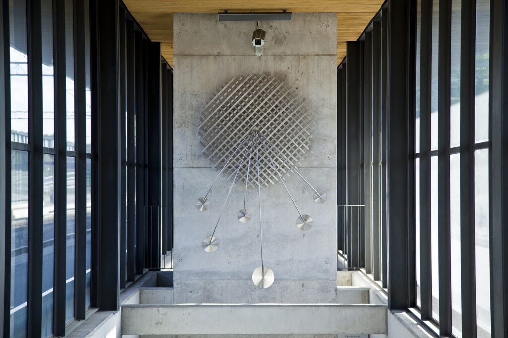 Laitureille johtavien portaikkojen yläpuolella. – Rautatieasema, Mannerheiminkatu, Lahti.
