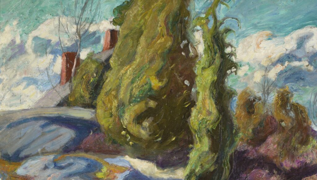 Petit Palais’ssa avautuva näyttely esittelee Pekka Halosen ainutlaatuista luontosuhdetta ja elämää taiteilijayhteisössä. Lahden kaupungintalolta näyttelyyn lainattava kertoo molemmista. Maalauksessa jylhällä kalliolla kasvavien katajien lomasta pilkistää talon katto, jonka savupiiputkin istuvat luonnonmaisemaan. Kyseessä on taiteilijan hartaudella suunnittelema ateljeekoti Halosenniemi, joka rakennettiin Tuusulanjärven rannalle 1899–1902.